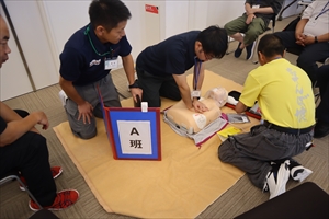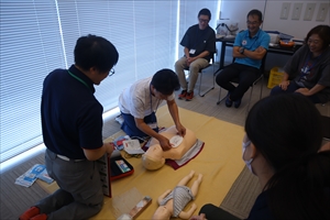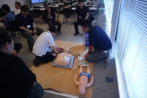 初日に引き続き、心肺蘇生法の精度向上とAED取扱い訓練や応急手当(異物除去・回復体位・搬送法等)を学び技術習得を図りました。また、救急隊の現場シミュレーション訓練を見学し、一次救命処置の理解を深め、救急隊への引継ぎ等も確認しました。