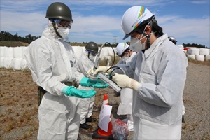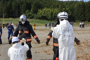 各消火活動隊は、(仮想)帰還困難区域で活動を実施した事から、通常区域へ退域する前にスクリーングを受けるシナリオで訓練を行いました。