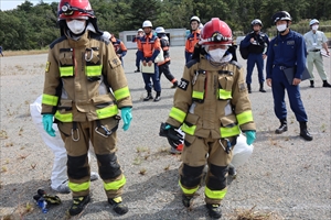 富岡消防署に応援隊の県内11消防本部、隣県の4消防本部(宮城県・新潟県・栃木県・山形県)が集結しました。双葉消防本部職員から訓練概要説明を受け、装備を着装(タイベックスーツ)し、各隊は消火訓練会場へ向かいました。