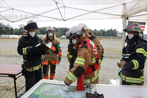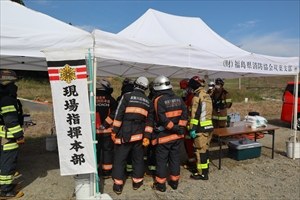 各応援隊は、消火訓練会場の指揮所へ集まり、活動指示を受けた後、各消火活動へ移行しました。