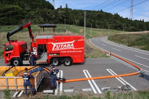 地元の大熊町消防団が可搬ポンプで防火水槽から仮設防火水槽へ給水作業を行い、双葉消防本部の大容量遠距離送水システム車(ハイドロサブ)が吸水を実施し、150㎜ホースを約500m延長し消火部隊へ送水しました。