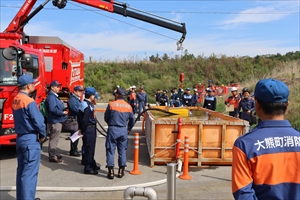 県内広域応援消防本部(7消防本部:福島・安達・須賀川・白河・会津若松・喜多方・南会津)については、小型可搬ポンプの取扱説明を受け、前進指揮所の西側山林の延焼防止を図るため、1トン水嚢(ウォーターバルーン)を設置して、小型可搬ポンプ(ミニストライカー)から吸水し放水活動を実施しました。