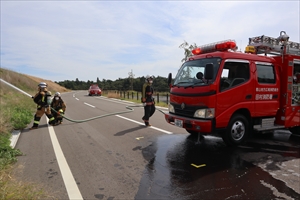 隣県消防本部(宮城県・新潟県・栃木県・山形県)は、前進指揮所の北側山林の延焼防止を図るため西側道路沿いに部署し、車両からの消火活動を実施しました。