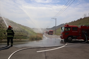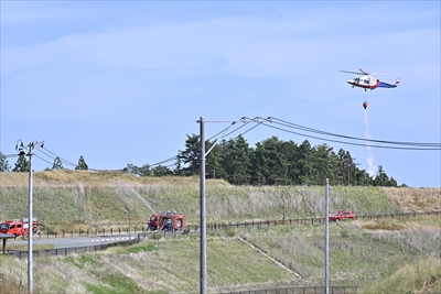 県内隣接の4消防本部(いわき・相馬・郡山・伊達)は、前進指揮所の北側山林の延焼防止を図るため南側道路沿いに部署し、車両からの消火活動を実施しました。