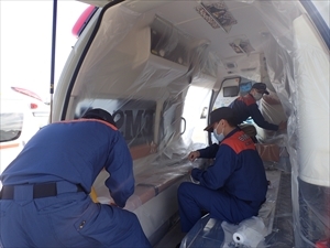 双葉消防本部の要請を受けた県内の消防本部から救急隊が集結。災害発生場所が、避難指示区域のため、放射線汚染及び拡散防止のため、救急車をシートで養生し、装備を整えたのち、出動する。