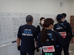 負傷者の一時収容と早期医療処置のため、ふたば医療センター附属病院内に応急救護所を設置し、多数傷病者対応を図ります。しかし、ふたば医療センター附属病院のみでは全ての負傷者の対応及び入院が困難なことから、福島県を通し県内の医療機関に災害派遣医療チーム(通称:DMAT)の要請を行いました。