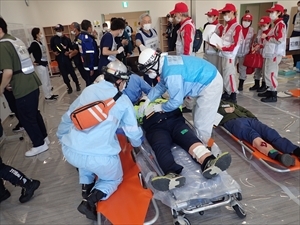 装備を調えた救急隊が、災害現場の一次集積所から負傷者を引き継ぎ、応急救護所の仮想福島県ふたば医療センター附属病院へ搬送を開始する。病院収容前には、負傷者のスクリーニング(汚染検査)を行い、病院内に放射線を持ち込まないように検査行います。