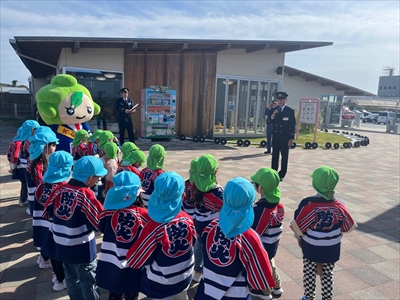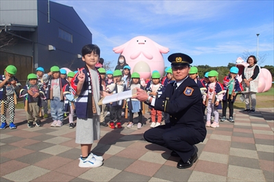 道の駅なみえでも元気な声で火の用心を呼びかけました。双葉消防本部公認キャラクターの「ふたばちゃん」も駆け付け、幼年消防クラブ員の子供たちと一緒に活動を行いました。