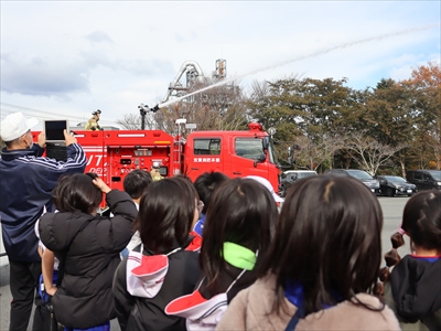 大型化学車の放水銃を使用した長距離放水を見て、児童たちは驚きながらも真剣な眼差しで見学をしていました。