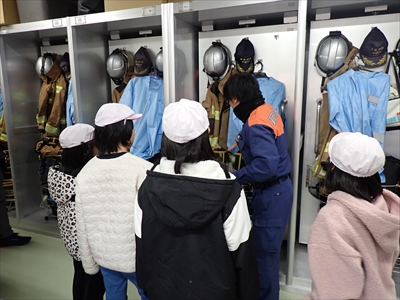 火災や救助、救急事案発生時における個人装備の説明を受け、真剣に話を聞いていました。