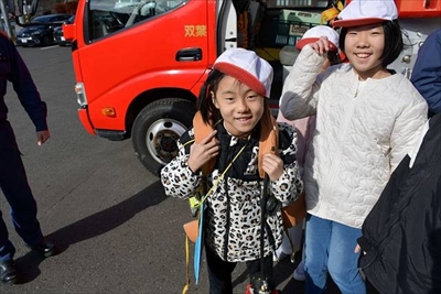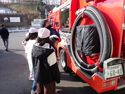 消防車両の装備や火災発生時の活動についての説明を受け、質問も多く真剣に学習していました。