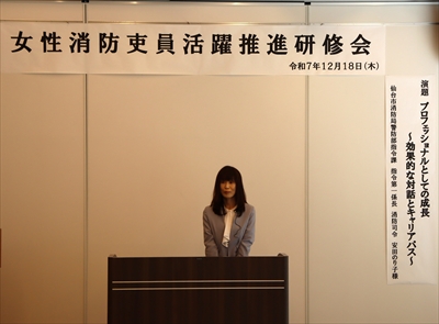 令和7年12月17日(木)仙台市消防局警防部の安田のり子様を招き、「プロフェッショナルとしての成長~効果的な対話とキャリアパス~」を演題に女性消防吏員活躍推進研修会を開催しました。安田様は総務省消防庁女性消防吏員活躍推進アドバイザーに任命されており、女性消防吏員への理解を深めるとともに、職務上の活躍を推進するための助言や留意点についてご講演をいただきました。当消防本部には2名女性消防職員が採用され、現在活躍中です。今後、なお一層の働きやすい環境作りがいかに大切かを受講した職員全員が改めて感じることが出来ました。