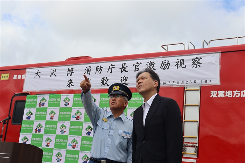 令和7年9月26日(金)総務省消防庁の大沢博長官が当消防本部管内を訪れ、双葉消防本部職員へ対し激励をいただきました。