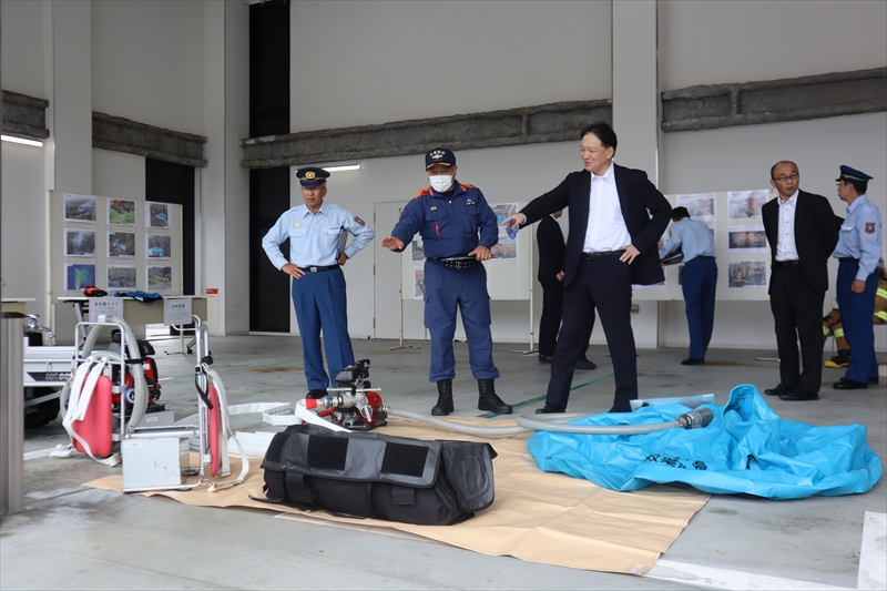 岡崎長官には職員激励の後、大阪市消防局から無償譲渡を受けた遠距離大量送水システム(ドラゴンブーストユニット)による放水訓練を視閲いただき、併せて警戒区域を視察されました。