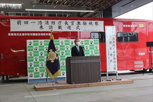 との絆を確認し、全国の消防職員が応援していることを実感できたと思う。今後も継続して応援するので、地域の再生復活のため尽力して欲しい」と励ましの言葉をいただきました。結びとして、大石長官から「全国の消防職員とともに改めて消防の力を示していこう」とエールが送られました。