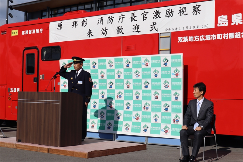 消防庁と致しましても、双葉消防本部の消防防災体制の強化に支援していきたいと思っておりますし、職員の皆様に安心して職務が遂行出来るように尽力をして参りたいと思います。この双葉消防本部の心は私たちの心として、消防庁としてもしっかり応援出来るよう頑張って参りますので、どうか皆さんには健康にご留意いただきまして、引き続きの活動、皆様のご健闘をお祈りいたしまして、激励の言葉とさせていただきます。