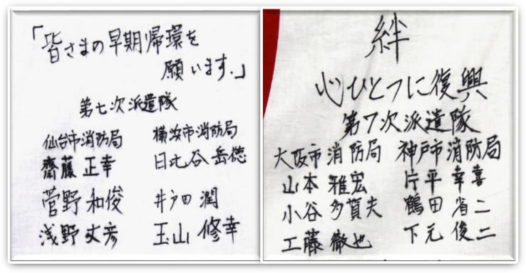 平成25年4月1日から「福島支援全国消防派遣隊」の支援を受けるに際し、日章旗に各派遣隊員のメッセージを寄せていただくことにしました。これに先立ち、岡崎浩巳消防庁長官、北村吉男消防総監(全国消防長会会長)、坂井修司全国消防長会事務局長から、激励のメッセージが寄せられました。