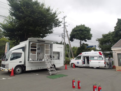 二ツ沼直売所駐車場にて梯子車、救急車などの消防車両を展示し、特に子供達からは「性能についての質問」や、「将来消防士になりたい」という声も出るなど好評でした。