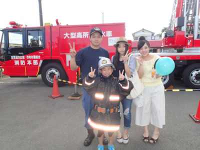 防火衣や空気呼吸器を着装し、梯子車をバックに記念撮影を行いました。