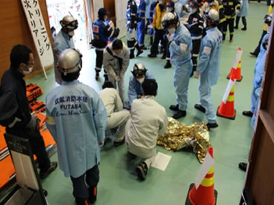 本訓練は、避難指示区域内(想定:帰還困難区域、実働:避難指示解除準備区域)の常磐自動車道において多数傷病者が発生したことを想定し、県内応援消防本部の出動手順及び双葉消防本部受援要領を再確認するものであり、福島県DMAT及び各関係機関との連携強化、初動体制の確立、医療機関とのネットワークの構築、放射線への理解を目的に、以下のとおり訓練を実施されました。