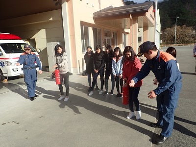 消火器の性能といざという時の使用方法を説明し、水消火器で消火体験していただきました。