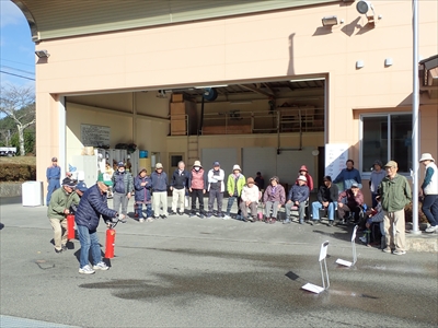 グラウンドゴルフ終了後、川内出張所にて水消火器による消火器取扱訓練を実施しました。
