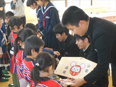 幼年消防クラブ員より少年消防クラブ員へ絵馬の贈呈。