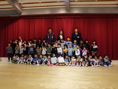園児たちと記念撮影を行いました。 これから、空気が乾燥し火災が発生しやすくなります。火の取り扱いには充分注意しましょう。