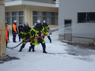 消防団ポンプ車からホースを伸ばし、筒先を設定しました。放水準備完了。放水始め。