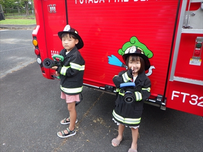子供用防火衣や子供用救助服を着装し、車両をバックに記念撮影。