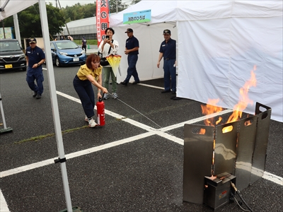 消火体験、大型化学車・救急車の展示を行いました。実際に水消火器で火を消したり、普段間近で見ることのできない車両に大勢の来場者が興味を持ち、双葉消防職員より説明を聞き地域住民との交流の場となりました。