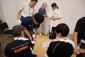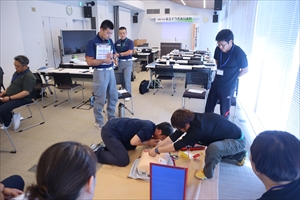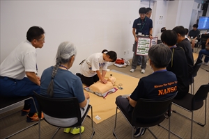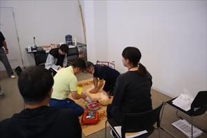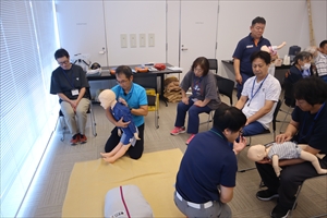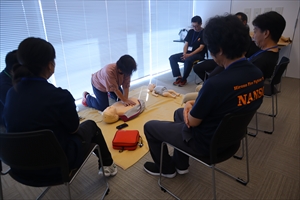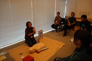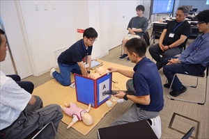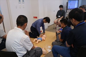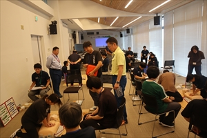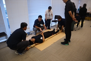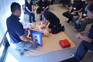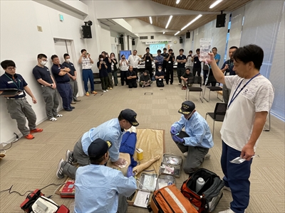 初日に引き続き、心肺蘇生法の精度向上とAED取扱い訓練や応急手当(異物除去・回復体位・搬送法等)を学び技術習得を図りました。また、救急隊の現場シミュレーション訓練を見学し、一次救命処置の理解を深め、救急隊への引継ぎ等も確認しました。
