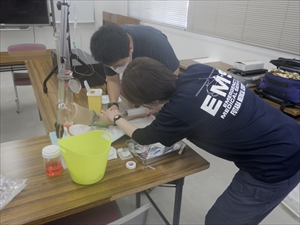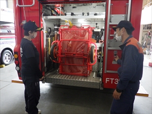③各消防車両についての説明を実施しました。 消火、救助資器材については触れる機会が少なく、多くの質問がありました。 ※タンク車説明の様子