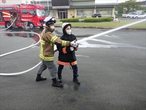 ④警防係による放水訓練を体験しました。 ガンタイプノズル、水放水、泡放水(CAFS)のメリットとデメリットについて理解しました。