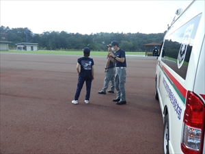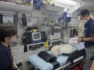 ⑥救急車に車載されている様々な資器材の説明と取扱訓練を実施しました。 現場での12誘導心電図伝送と画像伝送のシミュレーションを行いました。