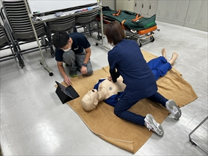 ⑨心肺停止傷病者に対する救急訓練を実施しました。 評価パットを使用しCPRの早さ、深さ、換気の評価を行い、院内CPRと現場CPRの違いについて体験しました。