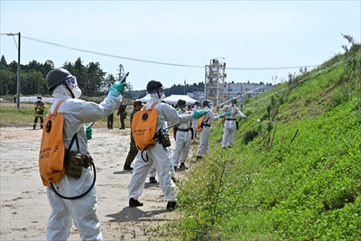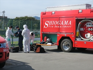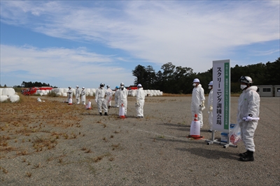 各消火活動隊は、(仮想)帰還困難区域で活動を実施した事から、通常区域へ退域する前にスクリーングを受けるシナリオで訓練を行いました。