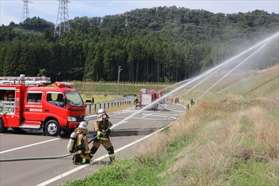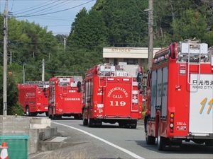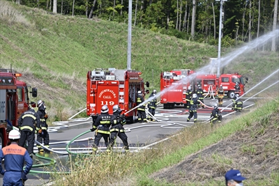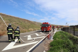 県内隣接の4消防本部(いわき・相馬・郡山・伊達)は、前進指揮所の北側山林の延焼防止を図るため南側道路沿いに部署し、車両からの消火活動を実施しました。