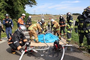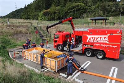 県内広域応援消防本部(7消防本部:福島・安達・須賀川・白河・会津若松・喜多方・南会津)については、小型可搬ポンプの取扱説明を受け、前進指揮所の西側山林の延焼防止を図るため、1トン水嚢(ウォーターバルーン)を設置して、小型可搬ポンプ(ミニストライカー)から吸水し放水活動を実施しました。