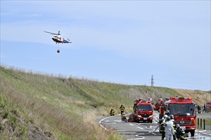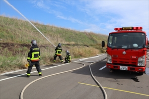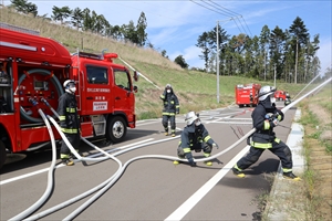 隣県消防本部(宮城県・新潟県・栃木県・山形県)は、前進指揮所の北側山林の延焼防止を図るため西側道路沿いに部署し、車両からの消火活動を実施しました。