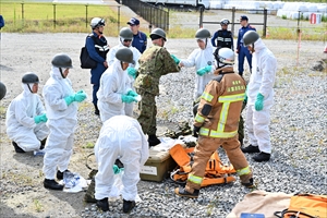 富岡消防署に応援隊の県内11消防本部、隣県の4消防本部(宮城県・新潟県・栃木県・山形県)が集結しました。双葉消防本部職員から訓練概要説明を受け、装備を着装(タイベックスーツ)し、各隊は消火訓練会場へ向かいました。
