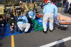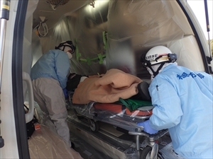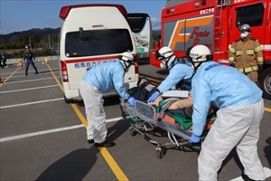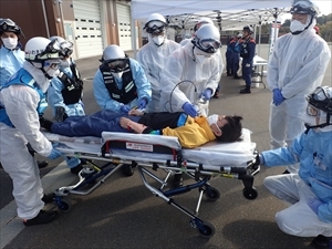 装備を調えた救急隊が、災害現場の一次集積所から負傷者を引き継ぎ、応急救護所の仮想福島県ふたば医療センター附属病院へ搬送を開始する。病院収容前には、負傷者のスクリーニング(汚染検査)を行い、病院内に放射線を持ち込まないように検査行います。