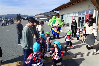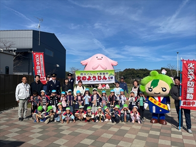 道の駅なみえでも元気な声で火の用心を呼びかけました。双葉消防本部公認キャラクターの「ふたばちゃん」も駆け付け、幼年消防クラブ員の子供たちと一緒に活動を行いました。
