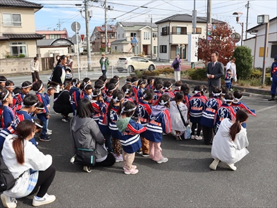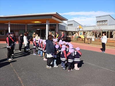 防火パレード出発式にて高木園長先生より「こども園のみんなで火事を起こさないよう呼びかけましょう。」とあいさつをいただきました。あおぞらこども園をスタートして、住民へ火の用心を呼びかけました。
