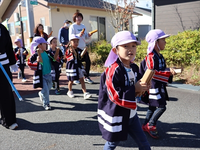 幼年消防クラブ員たちは、お揃いの法被を身にまとい一生懸命、拍子木を叩いて「火の用心」を地域住民へ呼びかけました。
