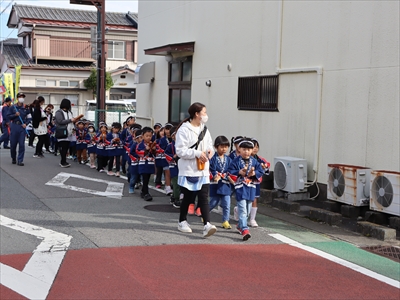広野町町長より「こども園のみんなで広野町のみなさんに、火事を起こさないよう呼びかけましょう。」とあいさつをいただきました。広野町駅周辺をスタートして、住民へ火の用心を呼びかけました。