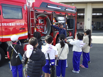 令和7年11月26日、広野町立広野小学校の児童(3年生)17名が富岡消防署楢葉分署にて消防署見学をおこないました。