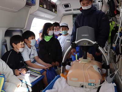 消防車と救急車の見学をしました。授業で学んだ資料を見ながら資機材に触れたり、乗車体験を行いました。