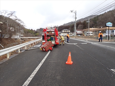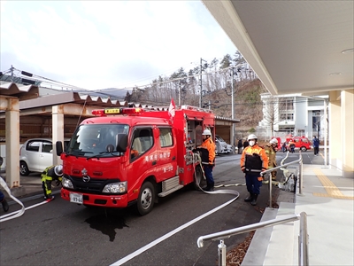 浪江消防署葛尾出張所のポンプ車は伝習館西側の葛尾川から揚水し、消火活動に必要な水源を確保しました。