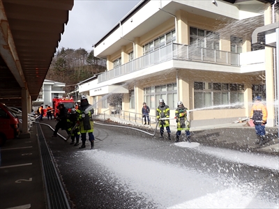 火点に向かって、葛尾村消防団がCAFS泡放射を実施しました。